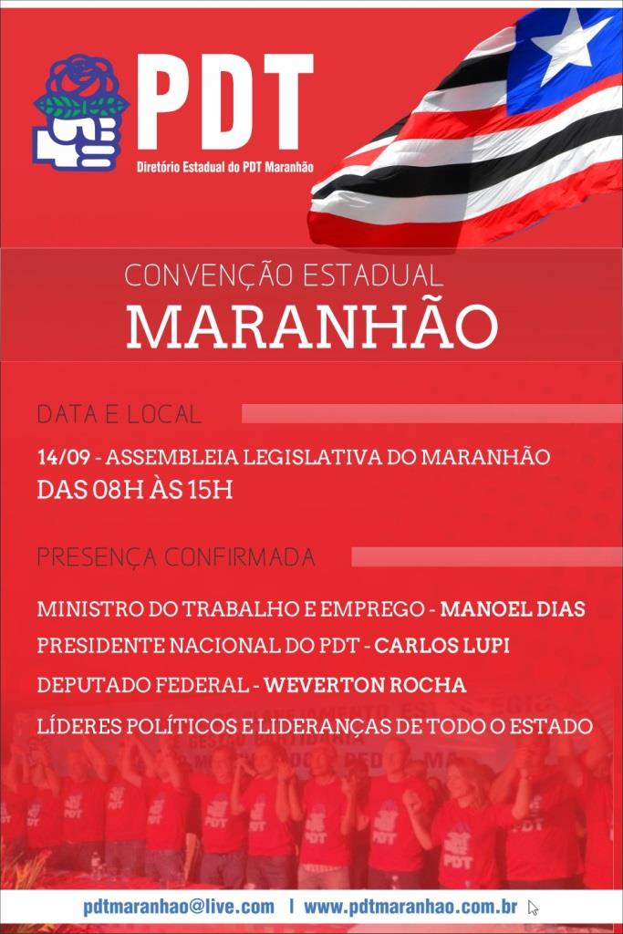 Será realizado neste sábado (14), a partir das 8h da manhã, na Assembleia Legislativa do Maranhão, a Convenção Estadual do PDT maranhense. O evento contará com a presença de Carlos Lupí (presidente nacional do PDT), Manoel Dias, (Ministro do Trabalho e Renda), além de lideranças e filiados de todo o Maranhão.