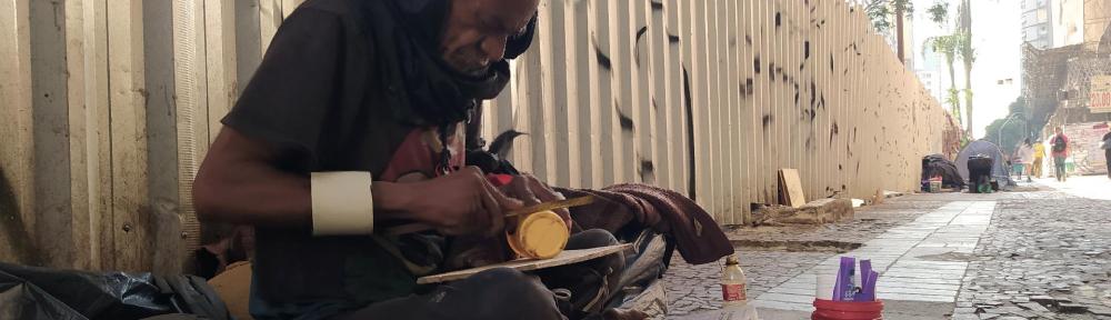 “Sei que é uma gripe que pode matar quem é fraco. Estou com meus exames em dia. Fiz uns no posto aqui perto”, diz enquanto fabrica pulseiras com embalagens de plástico. Julinho faz parte de dois grupos de riscos. Ele é idoso (64 anos) e mora na rua.