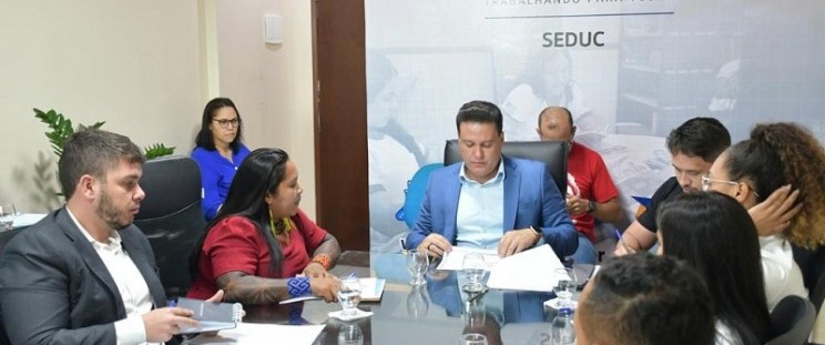 O vice-governador e secretário de Estado da Educação, Felipe Camarão, reuniu com a secretaria adjunta dos Direitos dos Povos Indígenas e sua equipe de assessores da Secretaria de Direitos Humanos e Participação Popular (Sedihpop), e alguns representantes de comunidades indígenas de diversos territórios, para tratar sobre questões de infraestrutura das escolas, Plano de Cargos e Carreiras dos professores indígenas, e acompanhamento pedagógico nas escolas.