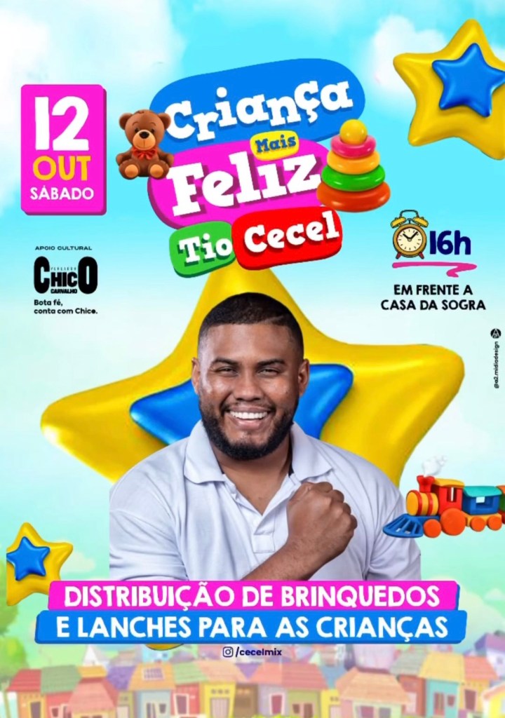 O cantor, compositor e empresário maranhense Cecel Mix, realiza neste sábado (12), Dia das Crianças, a 3ª edição do projeto “Criança Mais Feliz”,  no bairro da Madre Deus, região central de São Luís.