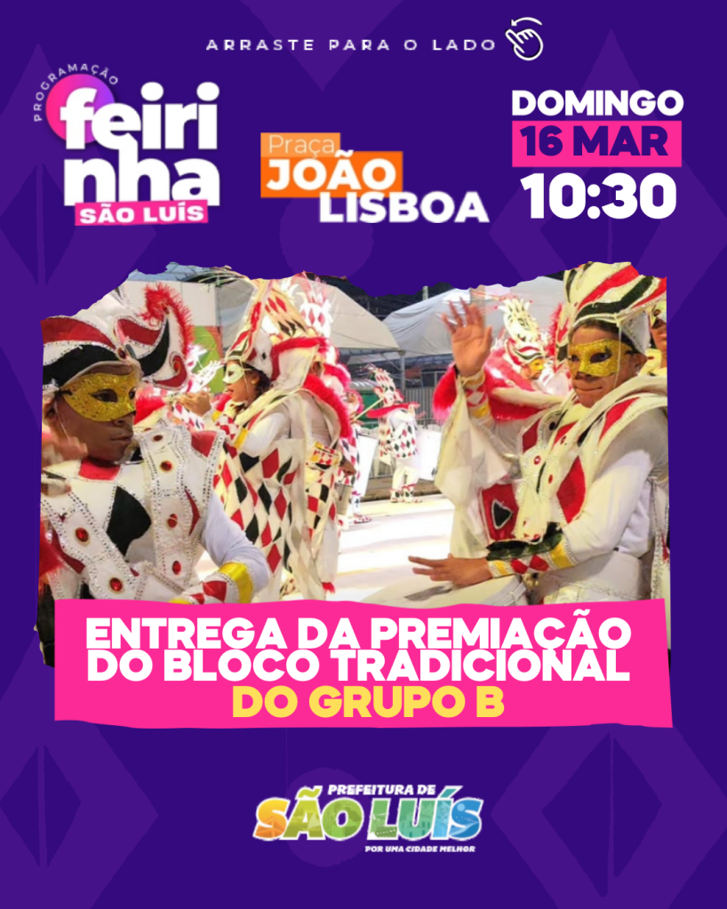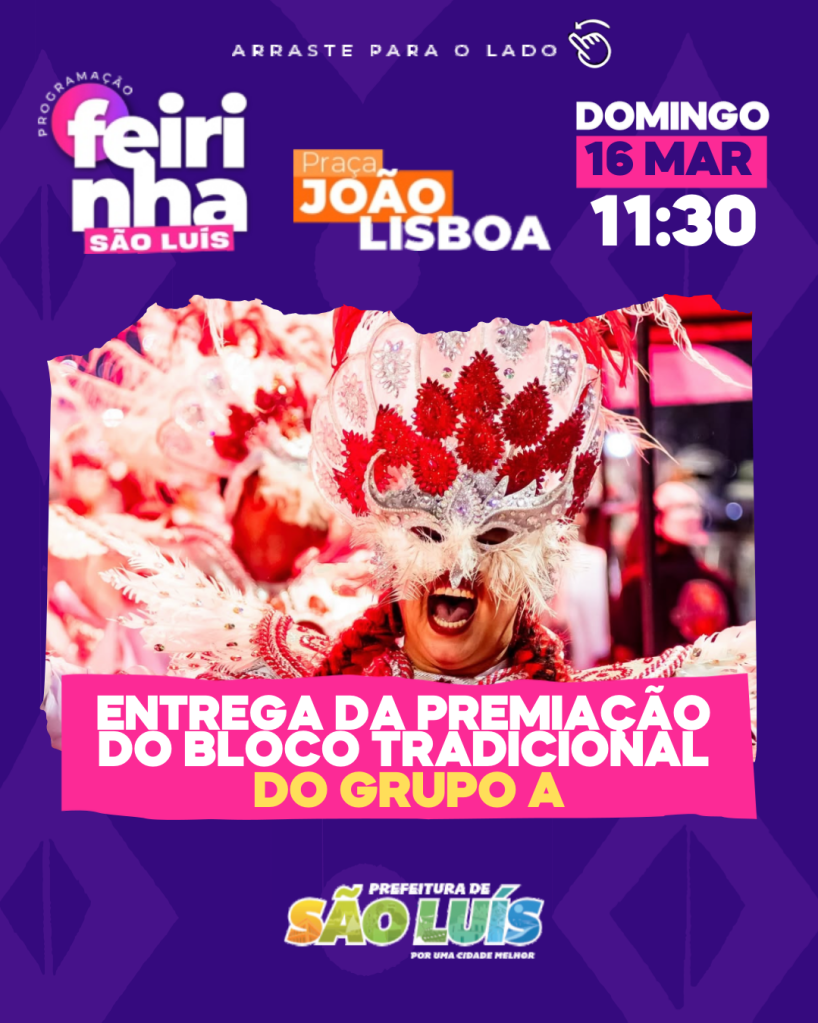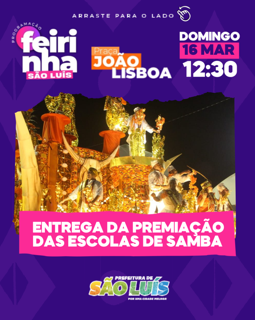 A Feirinha São Luís recebe, neste domingo (16), os campeões do Carnaval de São Luís. Durante o evento, serão entregues os troféus às agremiações vencedoras do Concurso da Passarela do Samba Chico Coimbra 2025.