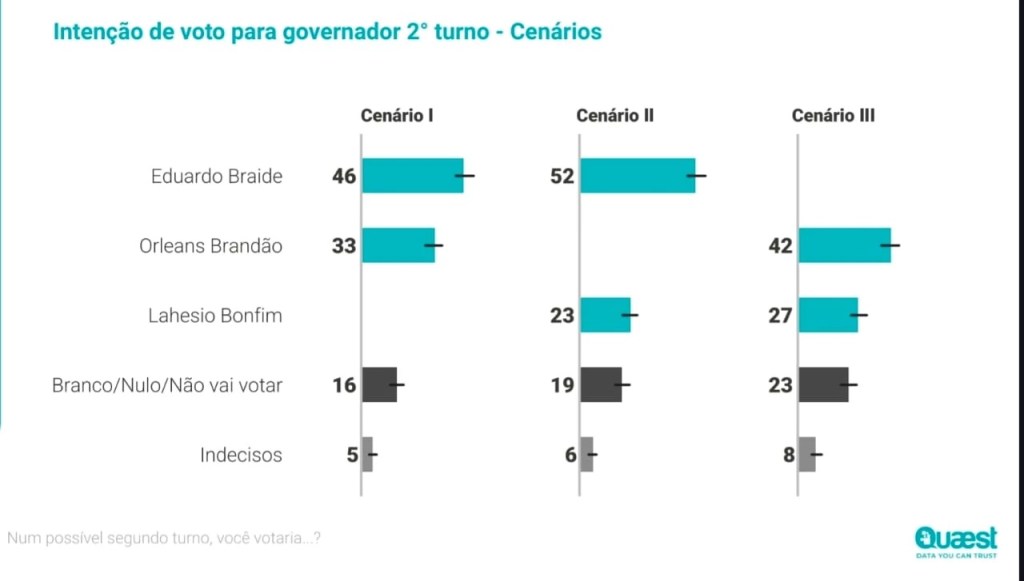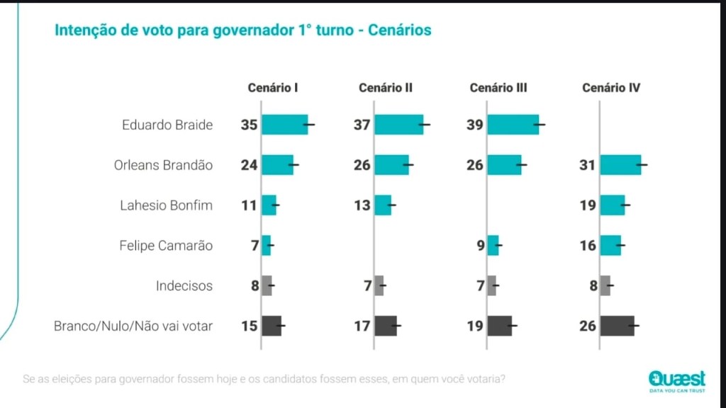 Os cenários estimulados mostram vantagem do prefeito da capital. No primeiro, Braide aparece com 35%, Orleans com 24%, Lahesio Bonfim com 11% e Camarão com 7%. Mas se a disputa não tiver Felipe Camarão os números são esses: Eduardo Braide com 37%, Orleans Brandão com 26% e Lahesio Bonfim com 13%.