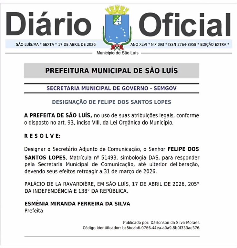 O secretário adjunto de comunicação, Felipe Lopes, foi designado para responder pela Secretaria Municipal de Comunicação de São Luís, conforme publicação no Diário Oficial do Município.