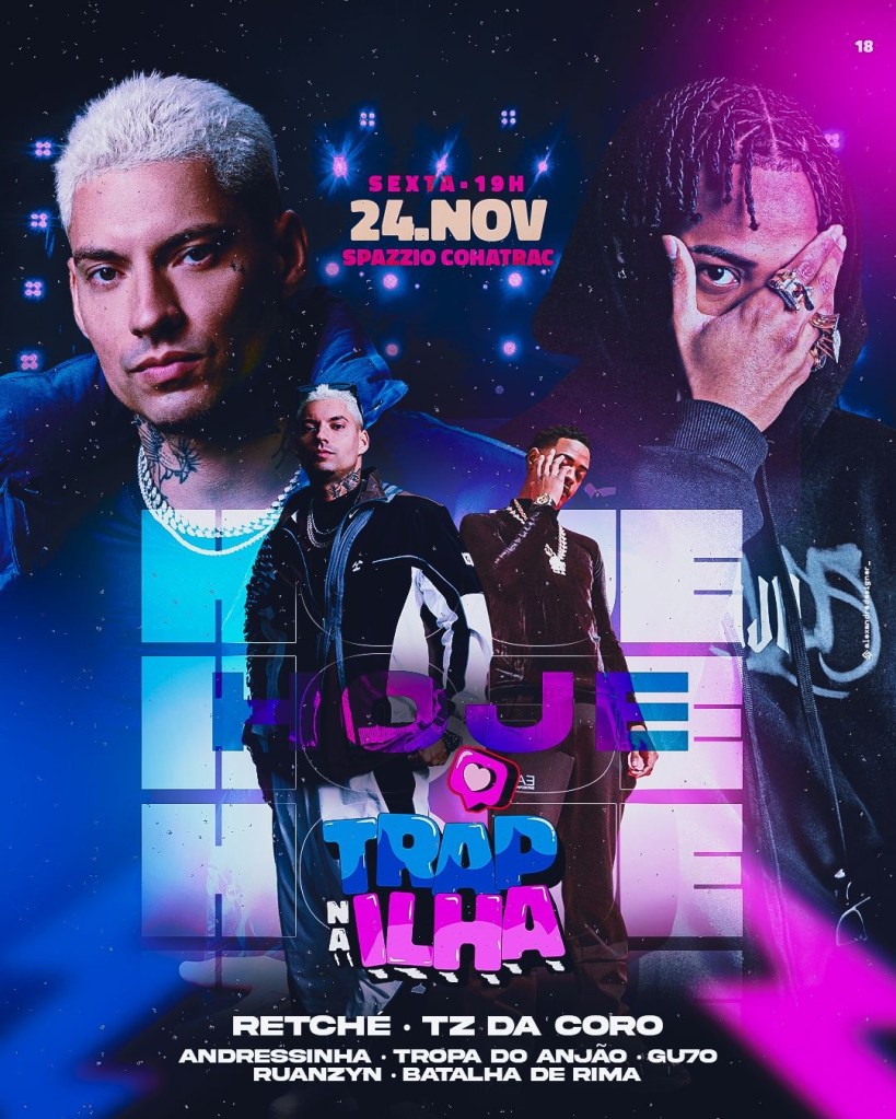 São Luís – É hoje, a partir das 19h, o Trap na Ilha, com a presença dos cantores Filipe Ret e TZ da Coronel. O evento será realizado na Spazzio, no bairro Cohatrac. A festa terá, ainda, a participação de Andressinha, Tropa do Anjão, GU70, Ruanzyn e Batalha de Rima.
