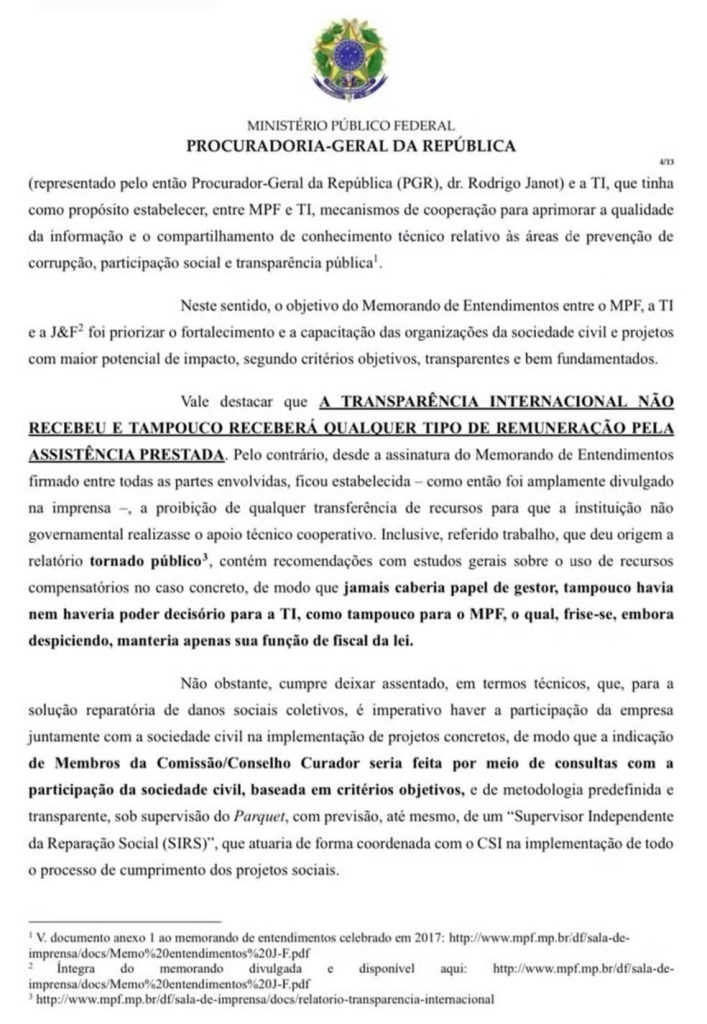 “A Transparência Internacional não recebeu e tampouco receberá qualquer tipo de remuneração pela assistência prestada. Pelo contrário, desde a assinatura do memorando de entendimentos firmado entre todas as partes envolvidas, ficou estabelecida a proibição de qualquer transferência de recursos para que a instituição não governamental realizasse o apoio técnico cooperativo”, escreveu a subprocuradora-geral da República Samantha Dobrowolski, então coordenadora da comissão permanente de assessoramento para acordos de leniência e colaboração premiada.