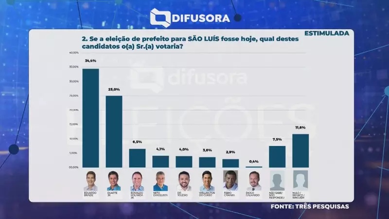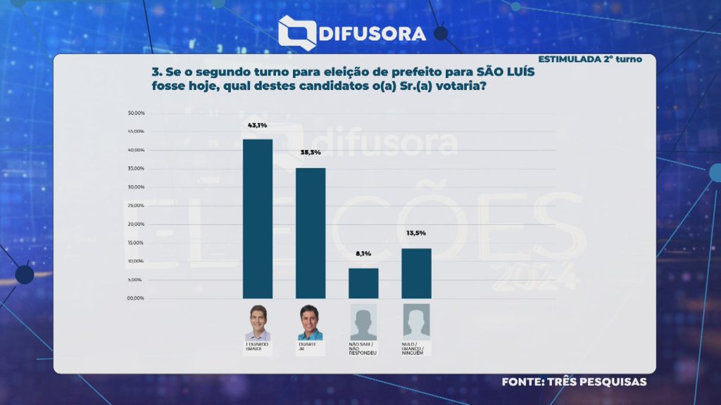 Outro cenário apresentado na pesquisa estimulada foi de uma disputa no segundo turno entre Braide e Duarte Jr. Nesse contexto, o atual prefeito aparece com 43,1%, enquanto o deputado federal tem 35,3%. Confira o resultado completo abaixo: