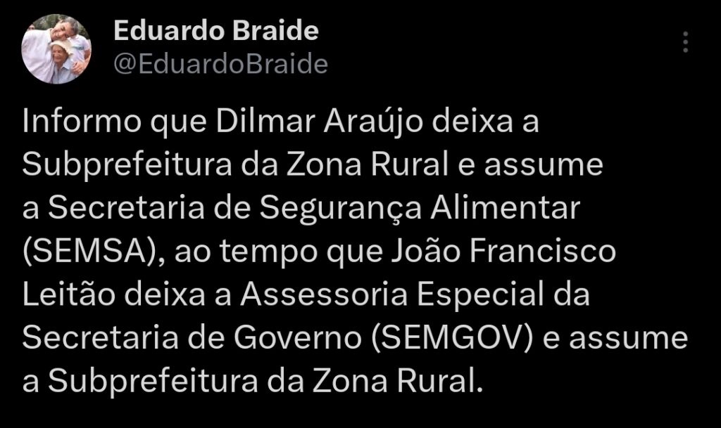 O subprefeito da Zona Rural, Dilmar Araújo passará a comandar a Secretaria Municipal de Segurança Alimentar (SEMSA). Ele será substituído por João Francisco Leitão que deixa a Assessoria Especial da Secretaria de Governo (SEMGOV) para assumir a Subprefeitura da Zona Rural.