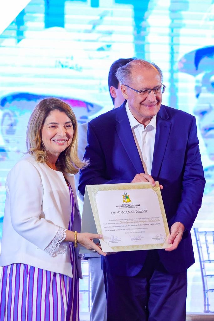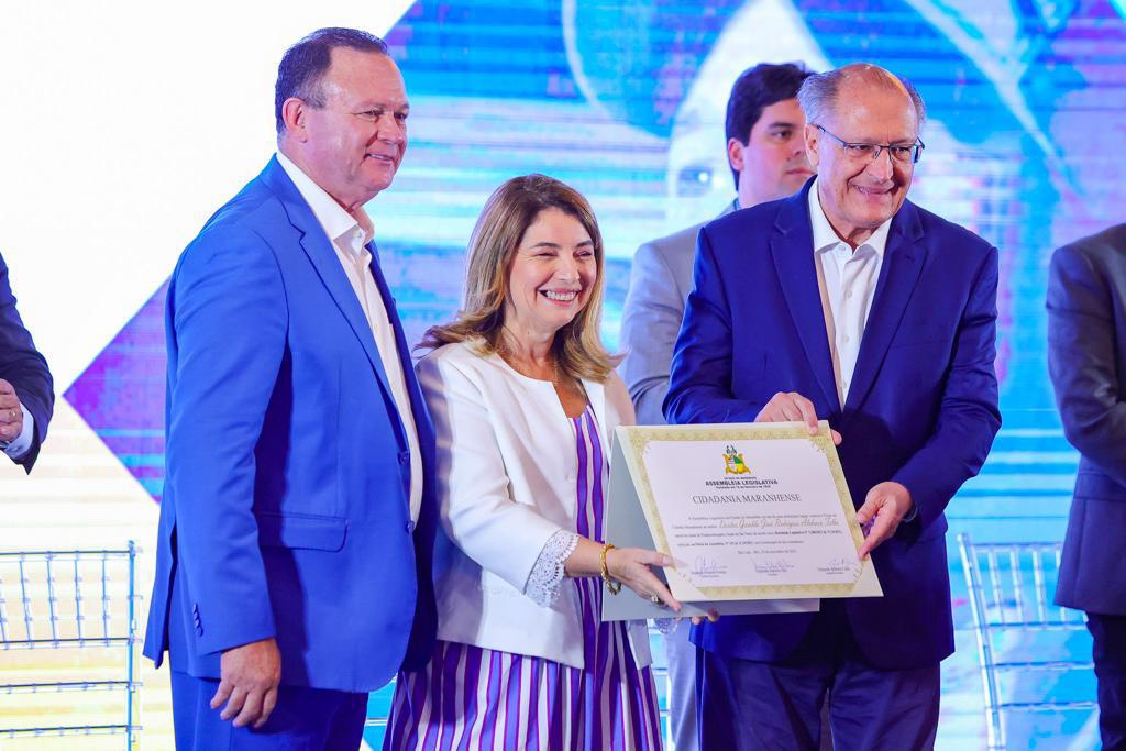 Iracema Vale, ao lago do governador Carlos Brandão, entrega o Título de Cidadão Maranhense ao vice-presidente Geraldo Alckmin