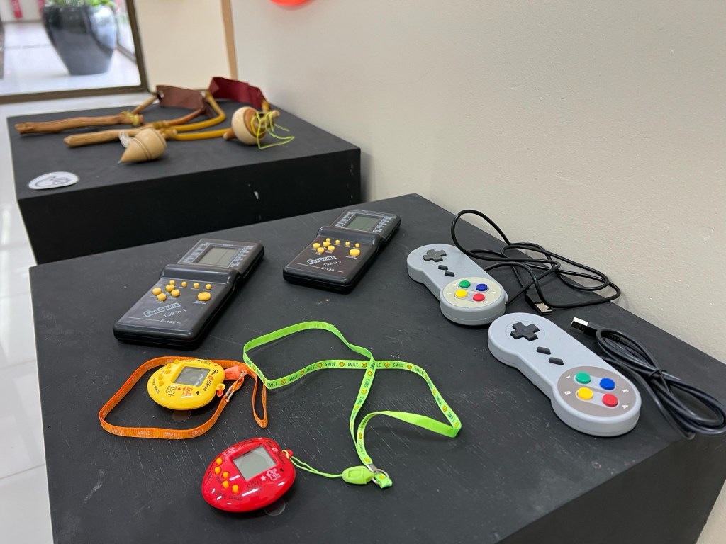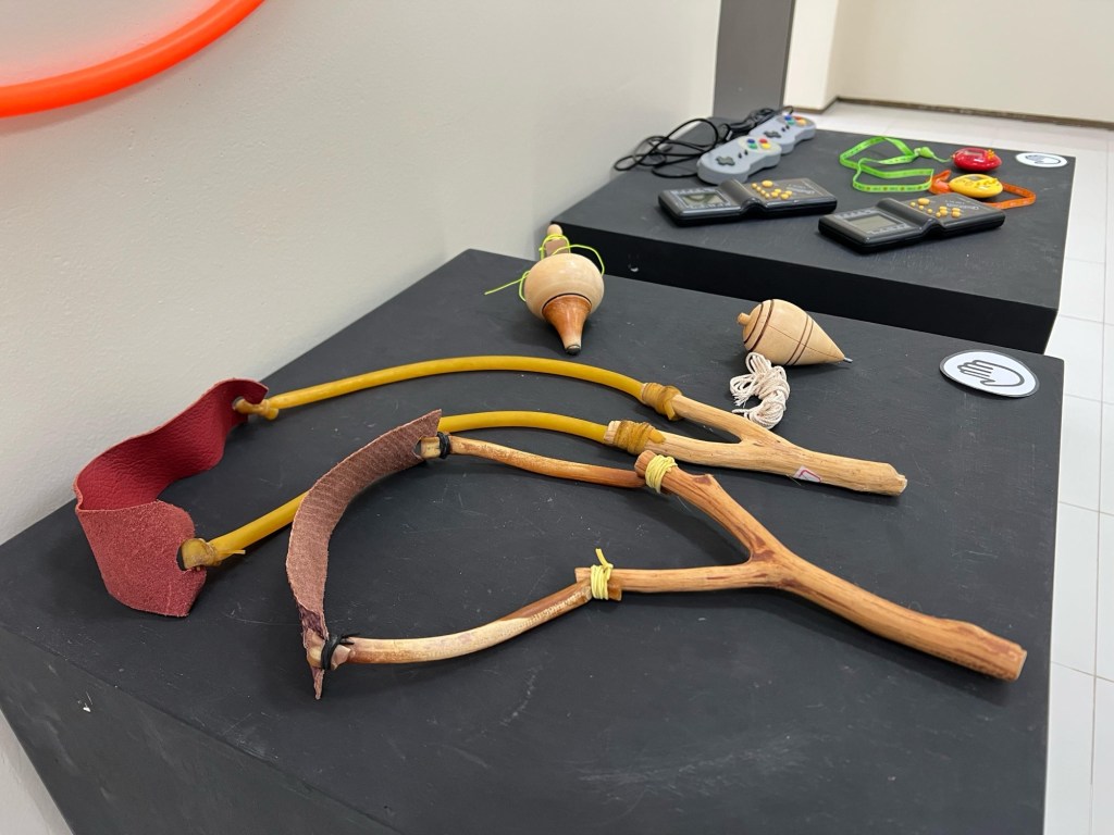 Em “Tempo de brincar”, Geiza Soares convida o público a revisitar as brincadeiras que marcaram gerações e a imaginar novas formas de se divertir. A exposição faz uma viagem a brincadeiras antigas, indo do pião ao carrinho de rolimã, sem deixar de lado as inovações do mundo contemporâneo, que se traduzem em novas perspectivas de recreação e entretenimento, como videogame e skate.