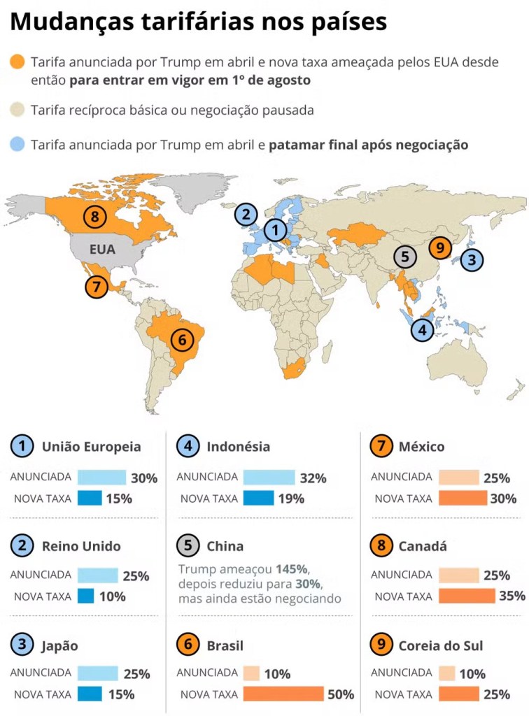 Vários países fizeram rodadas de negociação com os EUA, entre eles Japão e União Europeia, e conseguiram reduzir a “tarifa recíproca” inicialmente anunciada. Outros, por sua vez, foram alvos de novas ameaças de Trump, que elevou a tarifa prometida. Entre eles, Brasil, México e Canadá.