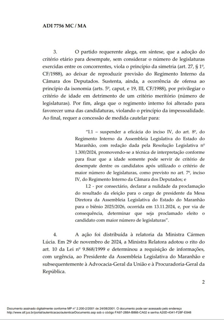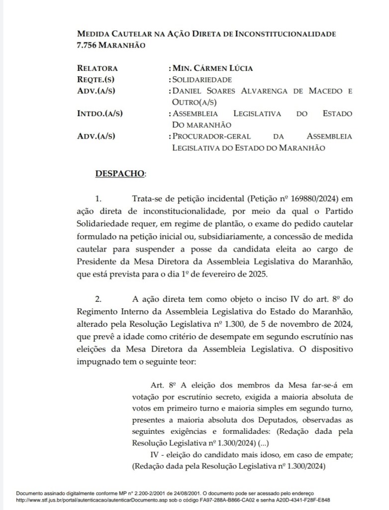 Os ministros do Supremo Tribunal Federal (STF), Dias Toffoli e Gilmar Mendes, seguiram a ministra Cármen Lúcia e votaram a favor da manutenção do critério de desempate por idade, que garantiu a reeleição da deputada Iracema Vale (PSB) para a presidência da Assembleia Legislativa do Maranhão. As decisões foram proferidas nesta sexta-feira (18), na Ação Direta de Inconstitucionalidade (ADI) nº 7.756, movida pelo partido Solidariedade e que questiona a constitucionalidade do critério.
