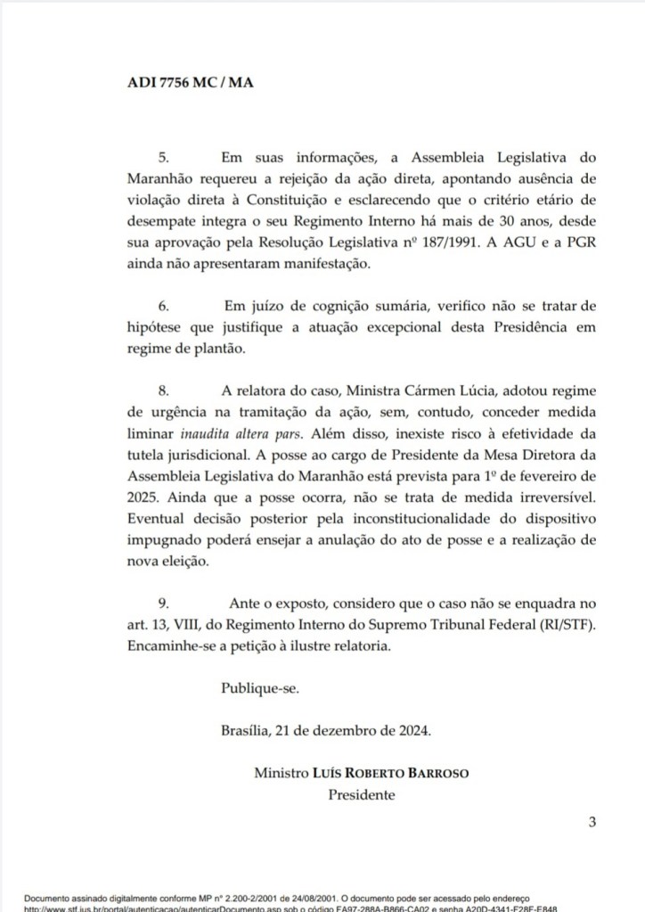 O ministro Luís Roberto Barroso, presidente do STF, rejeitou o pedido de medida cautelar apresentado pelo partido Solidariedade, que tentava barrar a posse da deputada Iracema Vale na presidência da Assembleia Legislativa do Maranhão. A decisão confirmou a eleição realizada em 13 de novembro.